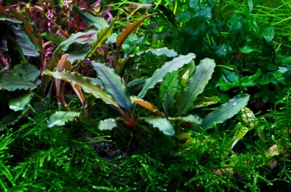 La Bucephalandra Godzilla es una planta acuática epífita, popular por sus hojas estrechas y alargadas con bordes ligeramente ondulados y coloración que va del marrón al verde oscuro, a menudo con reflejos iridiscentes o azulados. Es una planta de fácil cuidado y crecimiento lento, ideal para acuarios de bajo mantenimiento.